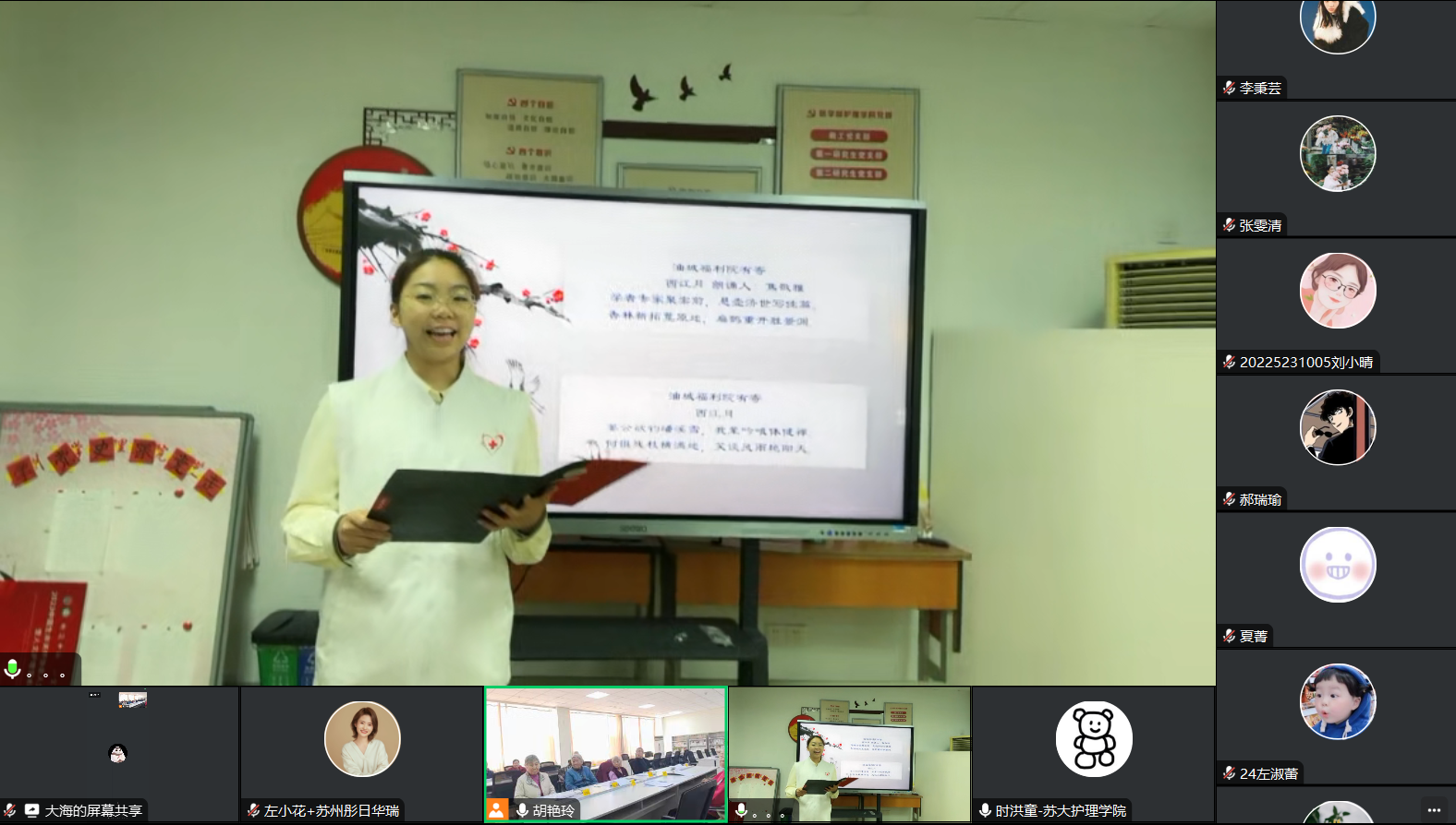 党建引领聚合力,敬老爱老暖人心。“南北翰林苑”云中悦老读书营首场联谊会的举办,是一场跨越山海、跨越年龄的深情对话,是苏州大学苏州医学院护理学院师生志愿者公益服务模式的成功探索,让苏州和大庆两座城市紧紧连接在一起,打造出独特的养老助老公益品牌。活动受到了大庆市民政局、大庆市第二福利院领导以及多名专家学者的高度肯定,参与活动的青年学子和老人们幸福感、自豪感油然而生。下阶段,护理学院将继续携手大庆第二福利院,以“南北翰林苑”云中悦老读书营为桥梁,以弘扬中华优秀传统文化为核心,定期开展格调高雅、形式多样的线上线下活动,为共同营造尊老敬老的文明风尚,推动构建和谐社会作为应有贡献。