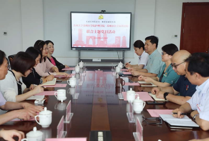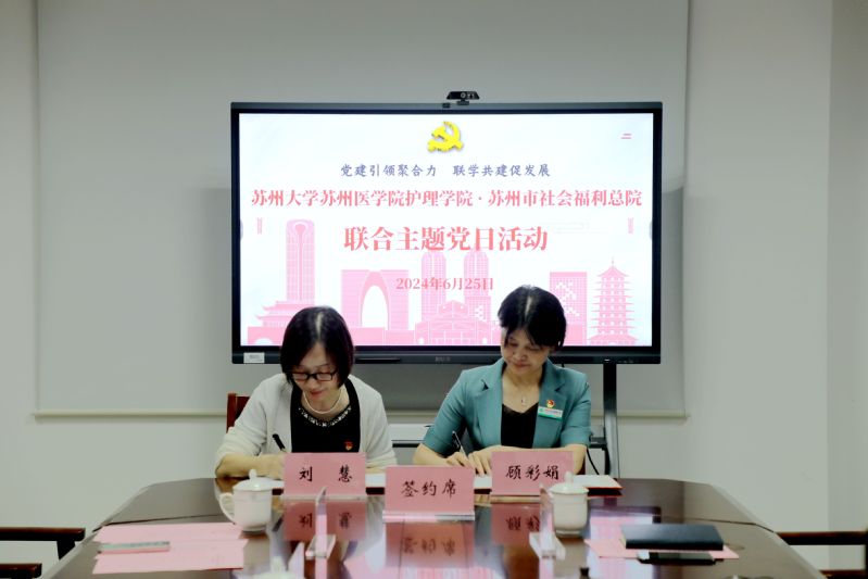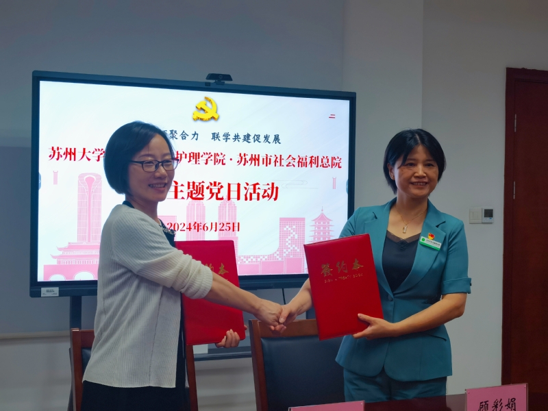 为认真贯彻落实习近平新时代中国特色社会主义思想,进一步创新基层党建工作载体,推动党建与业务深度融合,6月25日上午,苏州大学苏州医学院护理学院党委与苏州市社会福利总院党委开展联合主题党日活动,并举行党建共建签约仪式。苏州市社会福利总院党委书记、院长顾彩娟、党委副书记马千里、副院长惠志华,苏州大学苏州医学院护理学院院长李惠玲、党委书记刘慧、副院长田利等出席活动。