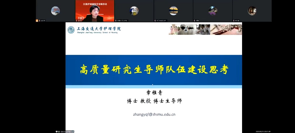 2023213日晚上7点,由苏州大学苏州医学院护理学院主办的第十二期“江浙沪闽研究生导师沙龙”以腾讯会议网络直播的方式隆重举行。本次沙龙主题是“护理学科建设及高质量研究生培养”,活动分为主题报告和专题发言两部分。沙龙活动邀请了江浙沪闽多家高校的护理学科带头人、学术骨干和研究生导师。与此同时,会议也吸引了我院各教学基地近300名师生参与,会议由我院院长李惠玲教授主持。