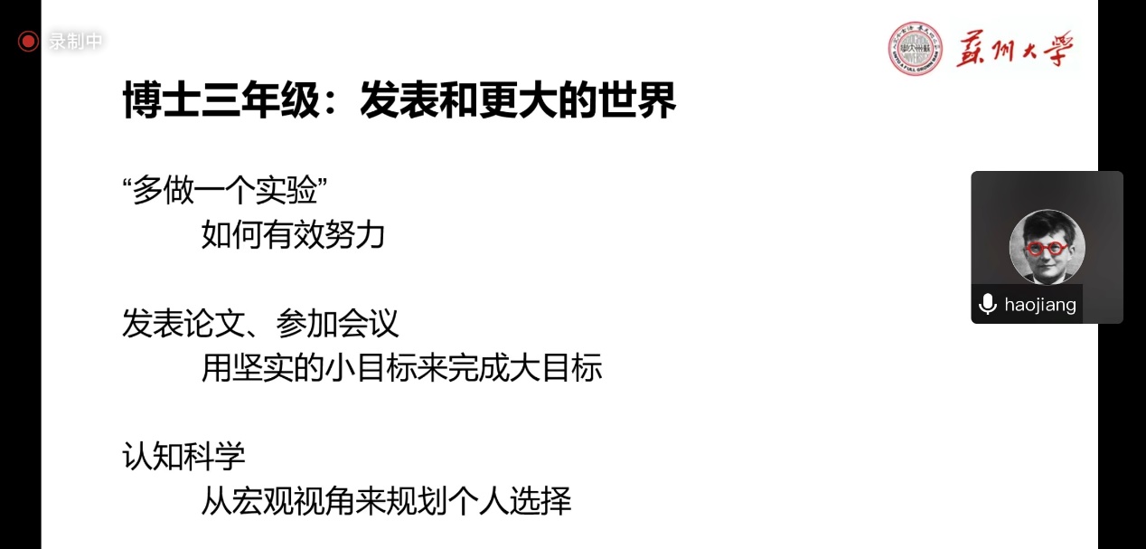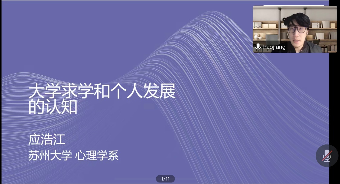 为了提高当代大学求学和个人发展的认知,2022年11月30日19:30-20:30,苏州大学苏州医学院护理学院邀请了第四届青年海归学者讲师团成员、苏州大学教育学院心理学系应浩江副教授,为2022级护理学院全体学生,在腾讯会议上开展了“关于大学求学和个人发展的认知”的专题讲座。本次讲座由苏州大学苏州医学院护理学院王丽教授主持。