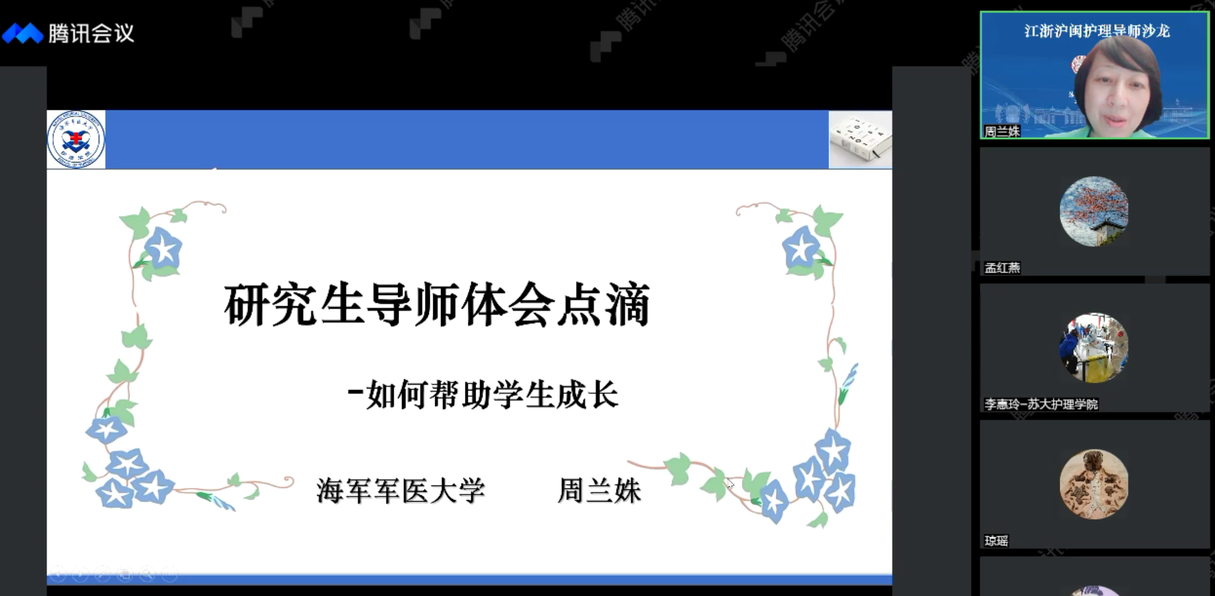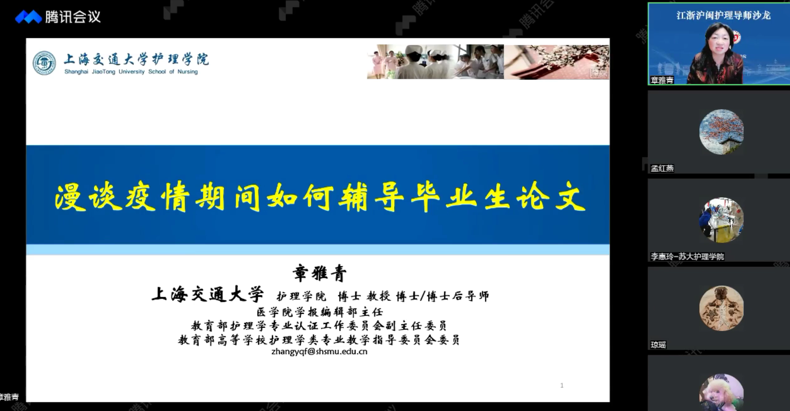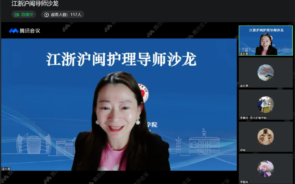 2022年5月6日晚上7点,苏州大学护理学院第十一期“江浙沪闽研究生导师沙龙”在云端顺利举行。本次沙龙邀请了江浙沪闽多家高校的护理学术带头人、学术骨干和研究生导师就“疫情下研究生线上课程及毕业论文指导”的主题进行专题报告。此次讲座由我院院长李惠玲教授主持,通过腾讯会议进行网络直播,吸引了包括护理学院及各教学基地在内300余名师生的参与。