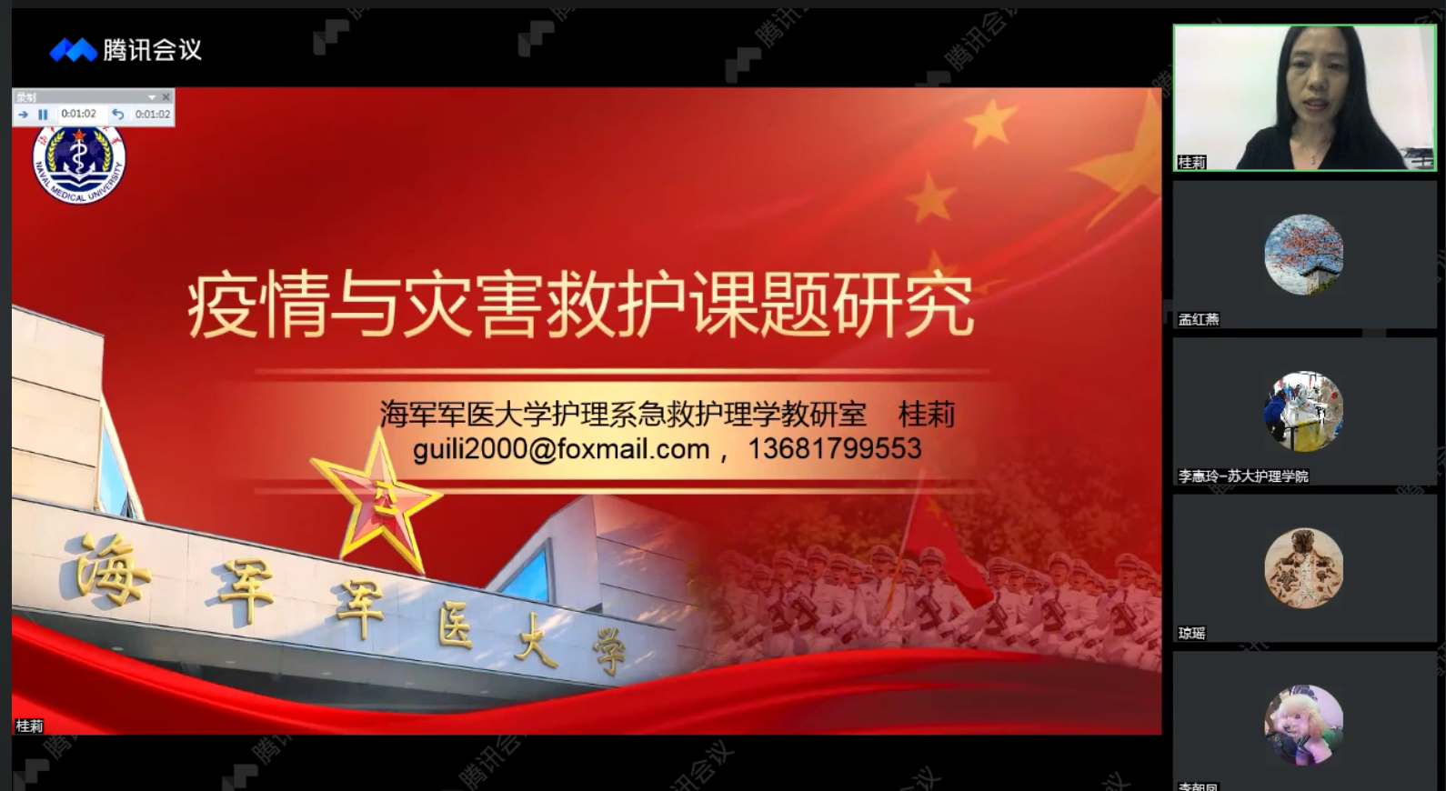 随后,海军军医大学桂莉教授以《疫情下灾害护理课题研究的新途径》为主题进行了分享交流,她从多途径保证选题的价值及线上线下结合实施课题两方面为大家进行深入介绍。桂教授的发言深切时事,关注于疫情下痛点难点问题,有助于延伸科学视角,为师生进行灾害护理选题与实施科研提供参考思路。