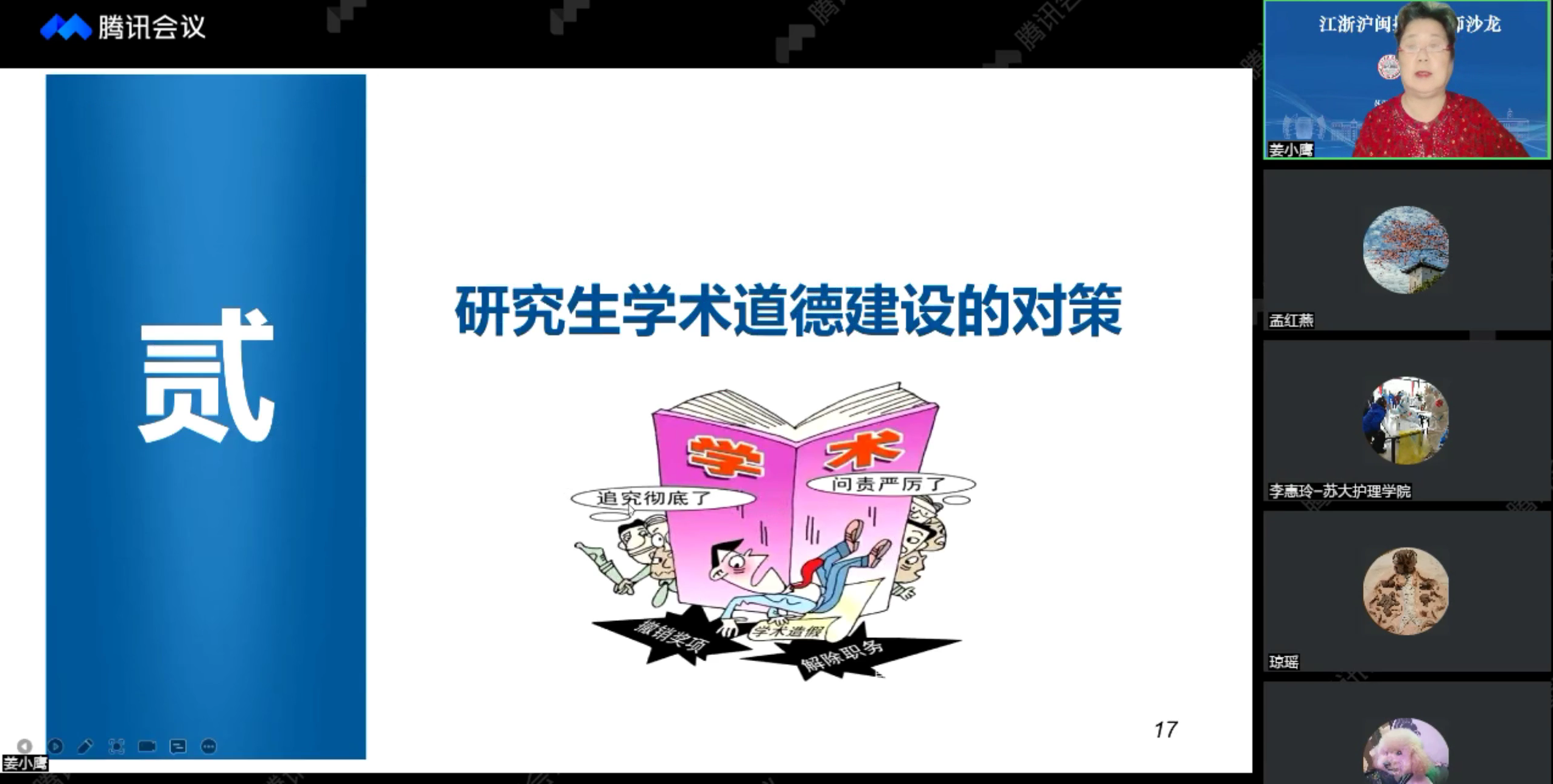 在导师沙龙的上半场中,中华护理教育专委会主任委员、中华护理杂志社社长、福建医科大学二级教授姜小鹰以《加强护理研究生学术道德培养》为题向听众作第一场报告。她指出当前部分研究生在初步踏上学术研究道路之时就背离了学术道德,变成“科研成果”快速制造者,因此,如何预防和惩治研究生学术失范已成为研究生教育的重要课题。对此,姜小鹰围绕学生、导师和制度等方面逐一分享研究生学术道德建设对策,以期为研究生学术诚信管理工作提供教育帮助。