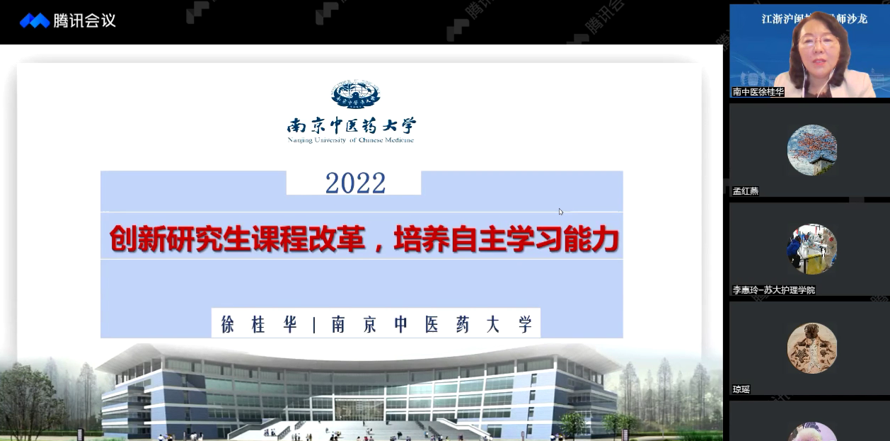 紧接着,教育部护理本科教育指导委员会副主任委员、南京中医药大学副校长、博士生导师徐桂华教授就《创新研究生课程改革,培养自主学习能力》进行主题汇报,她结合目前高层次临床护理人才不足、无法满足人们日益增长的健康需求的人才供需现状,从优化课程设置、教学策略改革以及多元教学评价三个层面介绍了如何提升研究生培养方案。徐教授指出,研究生培养过程最终是育人过程,希望导师以身作则、学生新老传承,并提出“护理人同舟共济,共创未来”的殷切希冀。