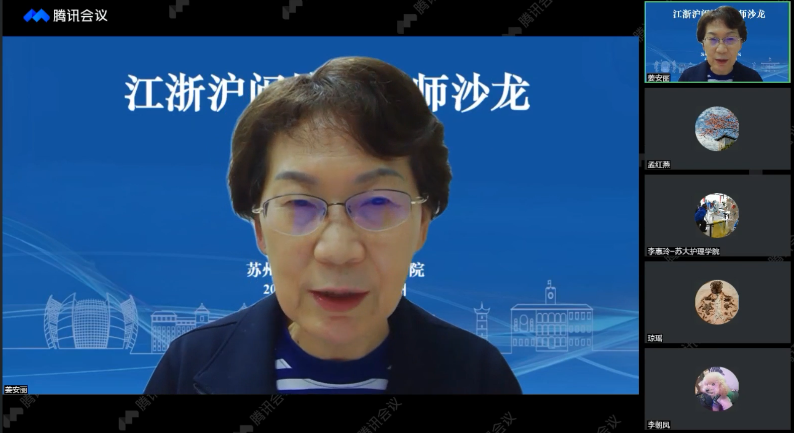 导师沙龙在教授们精彩的分享中很快来到下半场。教育部学科评议护理学科组召集人、解放军护理杂志、主编、海军军医大学姜安丽教授首先就《疫情期间多校联合的研究生课程线上教学》发表专题演讲,提出了许多针对研究生线上课程的建设性意见,如鼓励师生共开视频云中相见以增强双方投入度,以提高教学效果等。