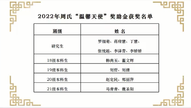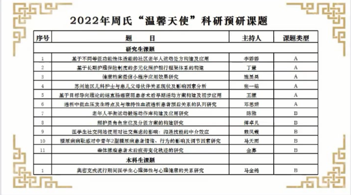 紧接而来的是激动人心的颁奖环节,李惠玲宣读了2022年“周氏温馨天使”奖助金获奖名单,田利宣读了2022年周氏助研基金评选结果。获奖代表丁慧、魏圣阳分别发表获奖感言,表示自己一定肩负使命,接下护理前辈手中的接力棒,展现出青年护理学子的蓬勃朝气和责任担当。