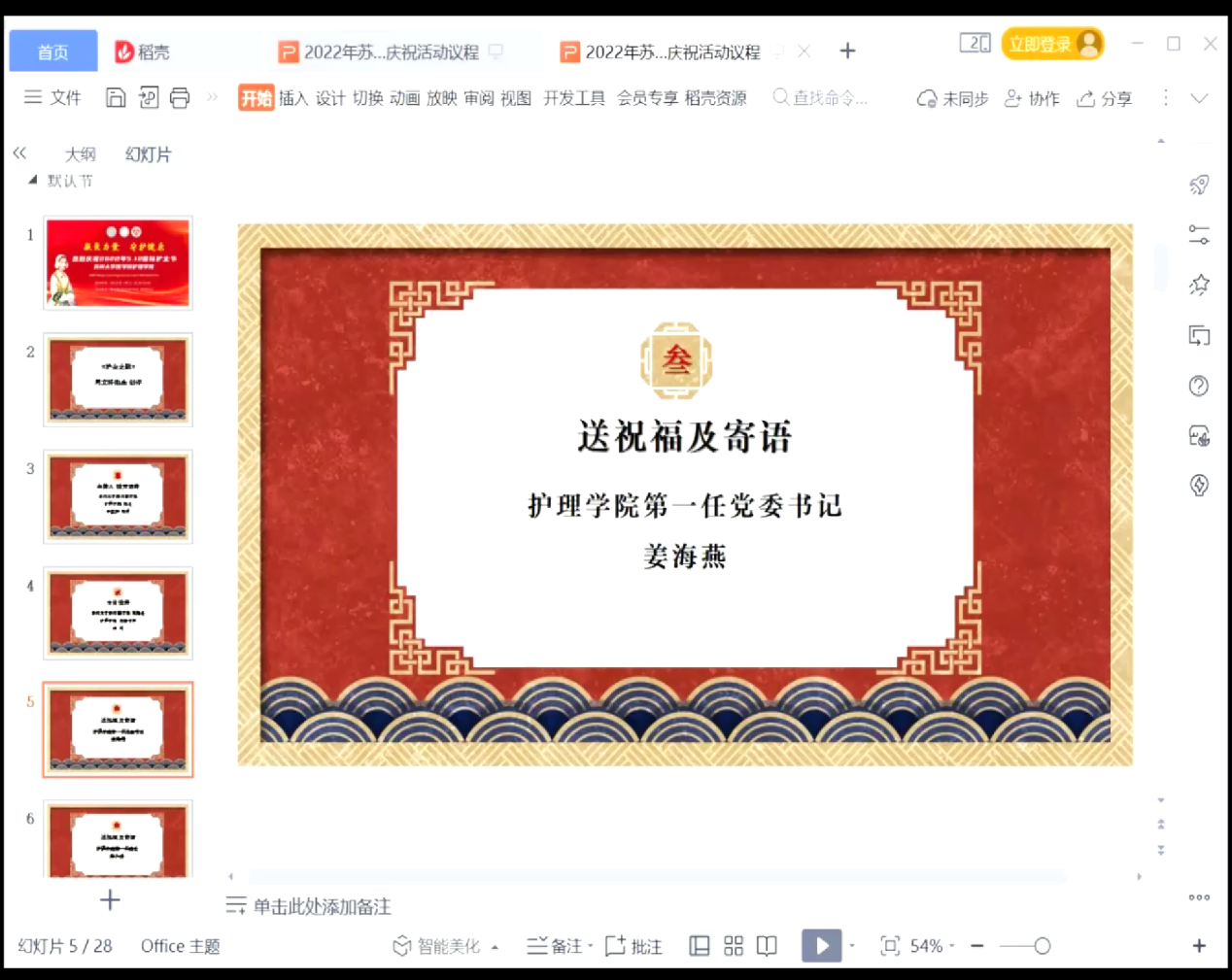 大会伊始,伴随着悠扬的护士之歌,李惠玲介绍出席活动的护理前辈,对前辈们的到来表示热烈的欢迎。随后龚政发表节日致辞,他表示,护士是卫生健康战线的重要力量,在实施健康中国战略和积极应对人口老龄化的国家战略过程中发挥着重要作用。在简要回顾自新冠肺炎疫情发生以来护士做出的突出贡献后,龚政向所有护理工作者致以节日问候与崇高敬意,并寄语我院护理学子继承与弘扬前辈护理人的精神,为健康中国建设、维护公共卫生安全不断作出新的贡献。