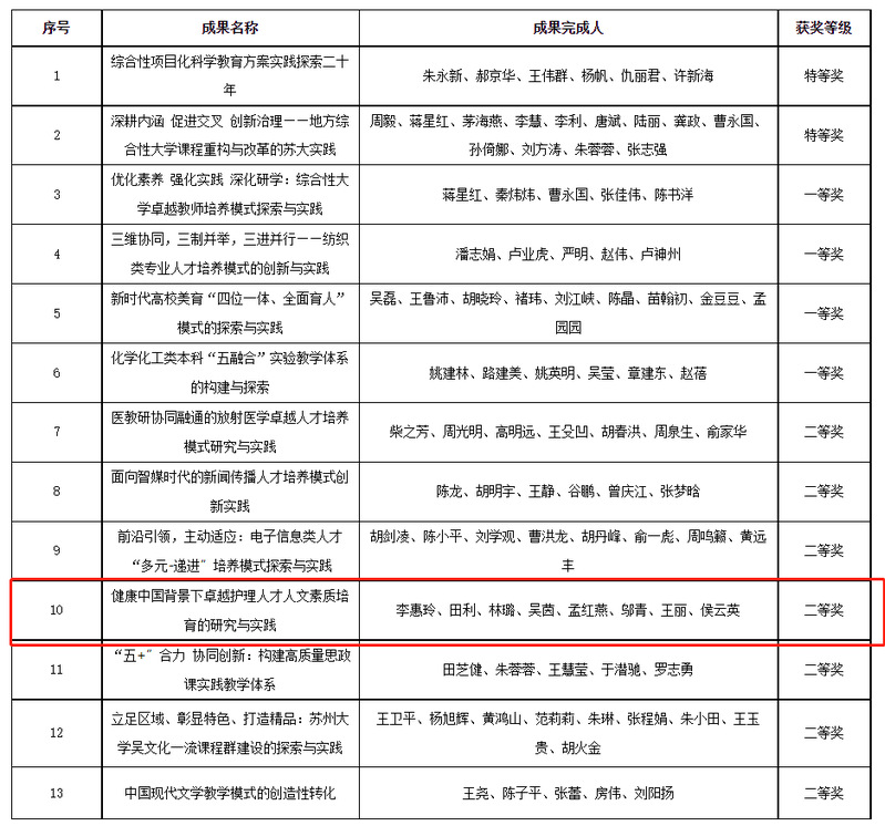 近日,江苏省教育厅发布了《关于公布2021年江苏省教学成果奖获奖项目的通知》(苏教人〔2022〕4号),共评选出2021年省教学成果奖950项,其中特等奖90项、一等奖280项、二等奖580项。苏州大学荣获特等奖2项(含基础教育类1项),一等奖4项,二等奖7项,获奖总数(高等教育类)并列位居全省高校第三,省属高校第一。我院李惠玲等老师申报的项目荣获二等奖。