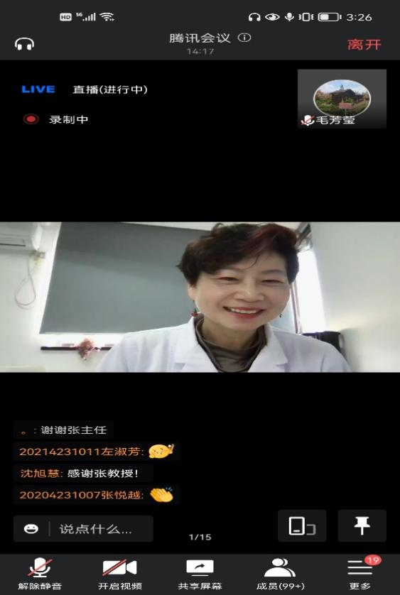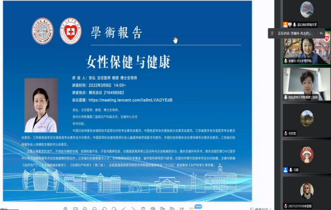 为庆祝“国际妇女节”,提高我校女性职工的自我保健与健康意识、普及女性健康知识,苏州大学机关党工委、校工会特联合苏州医学院护理学院于3月9日14:00在腾讯会议平台(ID:216498982)举办“女性保健与健康”的健康知识讲座及咨询活动,并邀请苏州大学附属第二医院妇产科张弘教授担任主讲嘉宾。本次活动由护理学院李惠玲院长主持,吸引了学校百余名师生的在线观看。