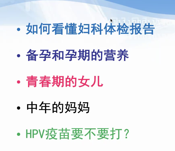 在讲座中,张弘主任首先以女性的成长为生命周期的时间线,从胚胎时期的女宝宝、青春期的女儿、备孕及孕期的母亲、中老年的女性为大家介绍了各时间段女性的保健要点;并在其后为大家解答了“如何看懂妇产科体检报告”、“宫颈检查的重要性”、“不同孕期的监测重点”、“孩子的性教育问题”以及大家关心的“HPV疫苗要不要打”等女性朋友日常较为关注的几个问题。