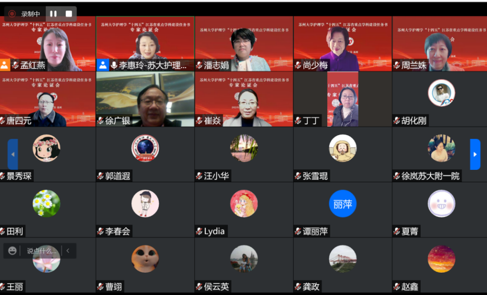 2022年2月16日上午,我校护理学院“十四五”江苏省重点学科建设任务书专家论证会在线上隆重举行。教育部高等学校护理学类专业教学指导委员会主任委员、全国医学专业学位研究生教育指导委员会护理分委会牵头人、北京大学护理学院院长尚少梅、国务院学科评议组召集人海军军医大学护理系学科带头人周兰姝、国务院学科评议组秘书长中南大学湘雅医学院护理学院院长唐四元、南京医科大学护理学院学科带头人崔焱,苏州大学学科建设与发展规划处处长潘志娟、苏州医学院常务副院长徐广银、护理学院院长李惠玲,副院长田利、徐岚、谭丽萍、姚文英及护理学院全体教师等参加论证会。会议由龚政书记主持。
