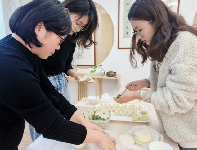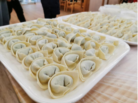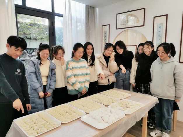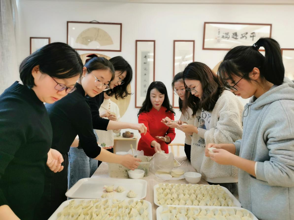 在我国的各个地区因为风俗的不同,所以过冬至的方式也不同。北方的大部分地区都会吃饺子,吃馄饨或者是宰羊吃羊肉。南方地区喜欢在这一天吃米团或者是长线米面。大家展示着来自各自家乡不同的包饺子手法,不同的馄饨形状,当然也少不了独具南方特色的肉团子和芝麻团子。孟红燕老师分享着自己独门的苏式包馄饨的手法,赵雪萍老师指导着传统北方饺子的包法,好一个其乐融融的景象!