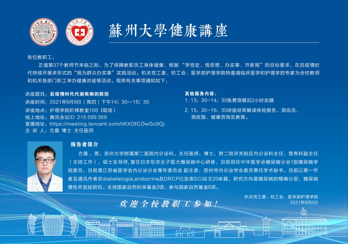 2021年9月9日,正值第37个教师节来临之际,根据“学党史、悟思想、办实事、开新局”的目标要求,也为更好保障教职员工身体健康、为员工送去温暖与关怀,苏州大学机关党工委、校工会、医学部护理学院于校本部维正楼106教室联合举办了名为“后疫情时代代谢疾病的防控”的健康知识讲座及咨询活动,并于腾讯会议平台(ID:215599369)同步直播。本次讲座由护理学院李惠玲院长主持,校机关党工委纪工委夏凤军书记、校工会顾志勇副主席出席了本次活动,苏州大学附属第二医院内分泌科主任、营养科副主任方晨博士担任分享嘉宾,共吸引了包含学校各院系、机关各部门的教职工及在读研究生在内的百余名师生的参与。