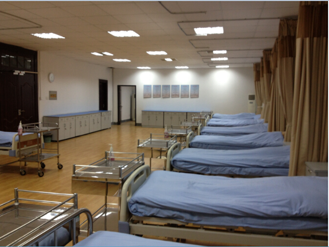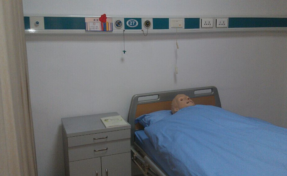 仿真重现医院重症监护室环境,氛围准备间和重症监护病房两部分。准备间内包括换鞋凳以及红外线感应洗手池,使学生了解消毒隔离之重要性。