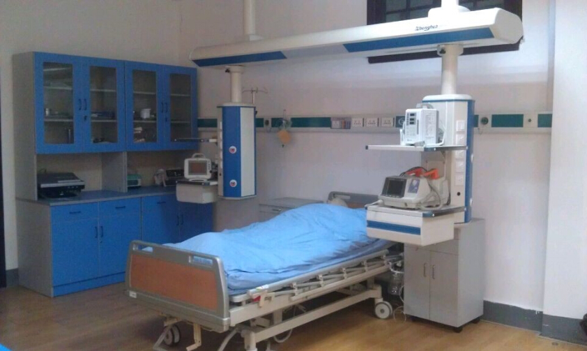 2)高级生命支持平台:配备电动病床、吊塔等设备,同时配备智能化无线综合模拟人。智能化无线综合模拟人完全无线,自备气液和电力系统,可适应多种真实环境,室内或室外教学。具有多种临床特征以及专为急救医疗人员设计的功能特性。该模拟患者无线并无绳,可放置于标准手术台、ICU病床、地面甚至车厢(模拟交通事故)。拥有评估系统、呼吸系统、心血管系统、泌尿生殖系统以及外伤特征,能够进行血氧饱和度监测,可内置创伤液体,可进行双侧无创血压及静脉注射,将仿真教育提升至崭新的境界。控制室中玻璃为单向玻璃,老师可以从控制室中看到学生的操作,在操作室中与学生进行互动。