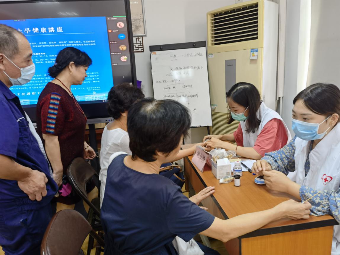 讲座结束后,校工会顾志勇副主席进行了发言,与李惠玲院长一起为方晨博士颁发了感谢证书,向方晨博士的精彩分享表示了衷心的感谢,并祝愿苏大全体教师节日快乐,身体健康,生活幸福。与此同时,中国南丁格尔志愿护理服务总队苏州大学医学部护理学院分队的师生志愿者们开展了关爱师生健康服务活动,为到场的老师们检测餐后血糖、血压、体脂率等,方晨博士和李惠玲院长也与来到现场的教职工们进行了互动交流,通过分析体检报告结果和提供健康咨询服务,耐心细致地为大家解答相关的各种健康问题,赢得了现场师生们的赞许!